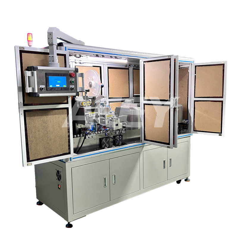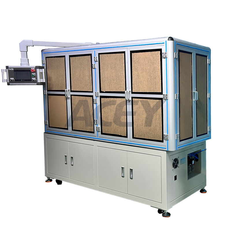 Die automatische Schrumpfschlauchmaschine ACEY-ASM-1C mit Sicherheitsabdeckung eignet sich zum automatischen Anbringen von Schrumpfschläuchen an AA-, AAA-, zylindrischen 18650-, 21700-, 26650- und anderen Lithiumbatterien mit Stahlgehäuse. Sie bringt die Schrumpfschläuche automatisch über ein Servo-Zuführsystem auf die Batterien auf, stanzt und fügt Isolierpads in die Schläuche ein und führt die Zellen anschließend durch den Schrumpfofen, wo sie für ein gleichmäßiges Schrumpfen rotieren. Anschließend ermöglicht eine reservierte Station die Tintenstrahlmarkierung, und die fertigen Batterien werden zur Pufferstation entladen. Sobald der Puffer voll ist, werden die Batterien automatisch in Kunststoffschalen geschoben.