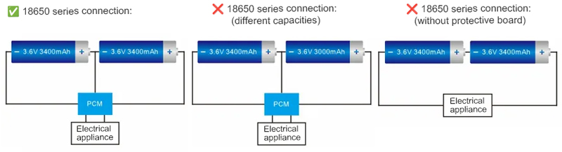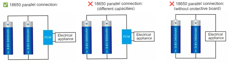 Aus Sicherheitsgründen müssen Lithiumbatterien an eine externe Schutzplatte angeschlossen werden, um jede Zelle zu überwachen. Parallelschaltung wird generell nicht empfohlen. Sollte eine Parallelschaltung dennoch erforderlich sein, müssen die Batterieparameter (Kapazität, Innenwiderstand usw.) übereinstimmen. Darüber hinaus müssen auch die Parameter der in Reihe geschalteten Batterien übereinstimmen. Andernfalls ist die Leistung des Akkupacks deutlich geringer als die einer einzelnen Zelle.