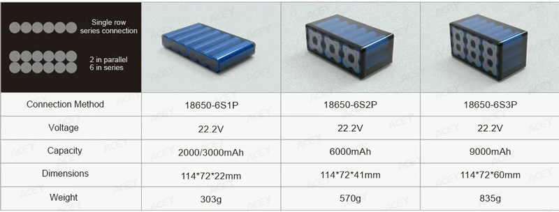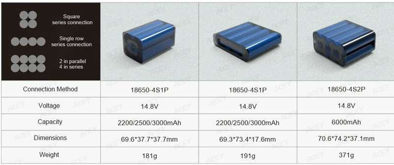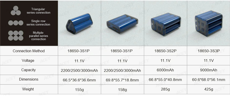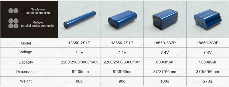 Vor dieser Berechnung müssen wir die Spezifikationen der im Akkupack verwendeten Zellen kennen. Da verschiedene Zellen unterschiedliche Spannungen und Kapazitäten aufweisen, variiert die Anzahl der für den Aufbau eines bestimmten Lithium-Akkupacks benötigten Reihen- und Parallelschaltungen. Gängige Lithium-Akkuzellentypen auf dem Markt sind beispielsweise 3,7-V-Lithium-Cobalt-Oxid-Zellen, 3,6-V-Ternärzellen, 3,2-V-Lithium-Eisenphosphat-Zellen und 2,4-V-Lithium-Titanat-Zellen. Die Kapazität hängt von Zellgröße, Material und Hersteller ab.