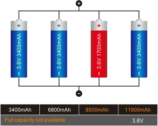 Die Spannung bleibt konstant, die Kapazität wird erhöht, der Innenwiderstand verringert sich und die Laufzeit der Stromversorgung wird verlängert.